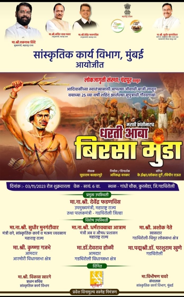 कुरखेडा(गडचिरोली) :- झाडीपट्टी व नागरी रंगभूमीवर अल्पावधीतच लोकप्रिय झालेले चुडाराम बल्हारपूरे लिखीत व अनिरुद्ध वनकर दिग्दर्शीत “धरती आबा-क्रांतीसुर्य बिरसा मुंडा” या तीन अंकी नाट्यची दखल महाराष्ट्र शासनाने घेतली असून स्वातंत्र्याच्या अमृत महोत्सव निमित्त सांस्कृतिक कार्य संचालनालय,महाराष्ट्र शासन,मुंबई अंतर्गत सदर नाटकाचा प्रयोग मौजा कुरखेडा (जिल्हा-गडचिरोली) येथे उद्या दिनांक-३ नोव्हेंबर २०२३ ला “लोकजागृती संस्था,चंद्रपूर” संस्थेतर्फे सादर करण्यात येणार आहे.