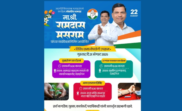 देसाईगंज(गडचिरोली):-येत्या,शुक्रवार २२ ऑगस्ट रोजी शेतकऱ्यांचे कैवारी तथा गोर-गरीब सर्वसामान्य जनतेच्या मनात घर करणारे आरमोरी विधानसभा क्षेत्राचे आमदार रामदास मसराम यांचा ५७ वा वाढदिवस मोठ्या उत्साहात साजरा करण्यात येणार आहे.तत्पूर्वी उद्या,गुरुवार २१ ऑगस्टला सकाळच्या सुमारास आमदार मसराम यांच्या वाढदिवस दिनाचे औचित्य साधून देसाईगंज शहरात तालुका काँग्रेस कमिटी देसाईगंज तथा आमदार रामदास मसराम मित्रपरिवार यांच्या वतीने विविध समाजोपयोगी  उपक्रम राबविण्यात येत आहेत.यात सकाळी ९ वाजे आमदार मसराम जनसंपर्क कार्यालयासमोर वृक्षारोपण कार्यक्रम,सकाळी १० वाजता ग्रामीण रुग्णालय देसाईगंज येथे रुग्णांना फळवाटप कार्यक्रम, सकाळी ११ वाजता माता मंदिर सभागृह माता वॉर्ड देसाईगंज या ठिकाणी भव्य रक्तदान शिबिर आयोजित करण्यात आले असल्याने सर्व नागरिक, युवक,कार्यकर्ते तथा सर्व पदाधिकाऱ्यांनी सहभाग दर्शवावा; असे तालुका काँग्रेस कमिटी देसाईगंज तथा आमदार रामदास मसराम मित्रपरिवार यांच्या वतीने आवाहन करण्यात आले आहे.