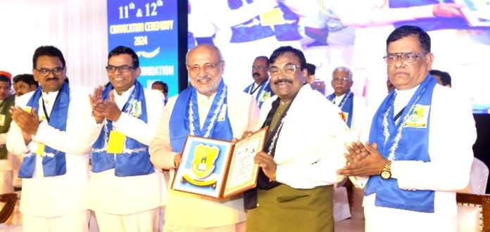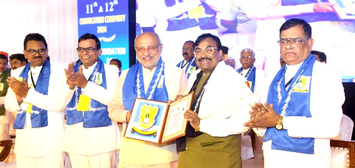 गडचिरोली :-शिक्षण ही मोठी ताकद आहे; शिक्षणामुळेच विद्यार्थ्यांच्या आयुष्याला वळण लागून विकासाचे द्वार खुले होत असल्याचे मत राज्यपाल सी.पी.राधाकृष्णन यांनी व्यक्त केले.गोंडवाना विद्यापीठाचा अकरावा आणि बारावा दीक्षांत सोहळा काल,२ ऑक्टोंबर रोजी राज्यपाल यांच्या अध्यक्षतेखाली विद्यापीठाच्या प्रांगणात संपन्न झाला.याप्रसंगी ते बोलत होते.वने,सांस्कृतिक कार्य आणि मत्स्य व्यवसाय मंत्री सुधीर मुनगंटीवार,कुलगुरु डॉ. प्रशान्त बोकारे,प्र-कुलगुरु डॉ.श्रीराम कावळे, कुलसचिव डॉ.अनिल हिरेखण,व्यवस्थापन परिषदेचे सदस्य,विविध विद्याशाखांचे अधिष्ठाता,परीक्षा व मूल्यमापन मंडळाचे संचालक डॉ.प्रविण पोटदुखे, वित्त व लेखाधिकारी सी.ए.भास्कर पठारे व्यासपीठावर उपस्थित होते.तर आमदार देवराव होळी,आमदार कृष्णा गजबे, जिल्हा पोलीस अधीक्षक नीलोत्पल,प्रभारी जिल्हाधिकारी तथा जिल्हा परिषदेच्या मुख्य कार्यकारी अधिकारी आयुषी सिंह आदी मान्यवर राज्यपालांच्या स्वागतप्रसंगी कार्यक्रमस्थळी उपस्थित होते.