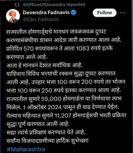 दसऱ्याची मोठी भेट दिली आहे.होमगार्ड यांचे मानधन जवळजवळ दुप्पट करण्यासंबंधीचा शासन निर्णय आज जारी करण्यात आला आहे.राज्याचे गृहमंत्री देवेंद्र फडणवीस यांनी यासंदर्भातील घोषणा केली आहे.हे मानधन देशात सर्वाधिक असल्याचेही फडणवीसांनी आपल्या एक्स (पूर्वीचे ट्विटर) पोस्टमध्ये म्हटले आहे.याशिवाय विविध भत्त्यांची रक्कम सुद्धा दुप्पट करण्यात आली आहे.